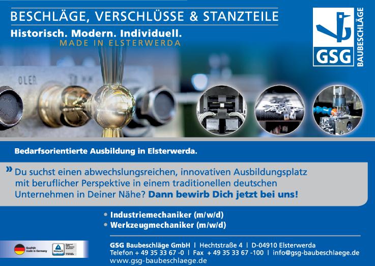 Die GSG Baubeschläge GmbH Elsterwerda, ein mittelständisches Unternehmen, im Süden Brandenburgs, führt seit 1993 eine über 100-jährige Tradition der Fertigung von Beschlägen in Elsterwerda fort. Neben der Produktion von traditionellen Beschlägen im Rahmen des Denkmalschutzes, der Sanierung und dem Neubau für eine Vielzahl von Objekten, werden ebenfalls technische Stanzteile und Sonderbeschläge für die Automobil-, die Automobilzubehörindustrie und den technische Gerätebau gefertigt. Das Unternehmen ist zertifiziert nach ISO 9001 sowie nach ISO TS 16949. Für die Produktion unserer Erzeugnisse setzen wir Stahl, Edelstahl, Aluminium und NE-Metalle bis zu einer Materialstärke von 6 mm ein.